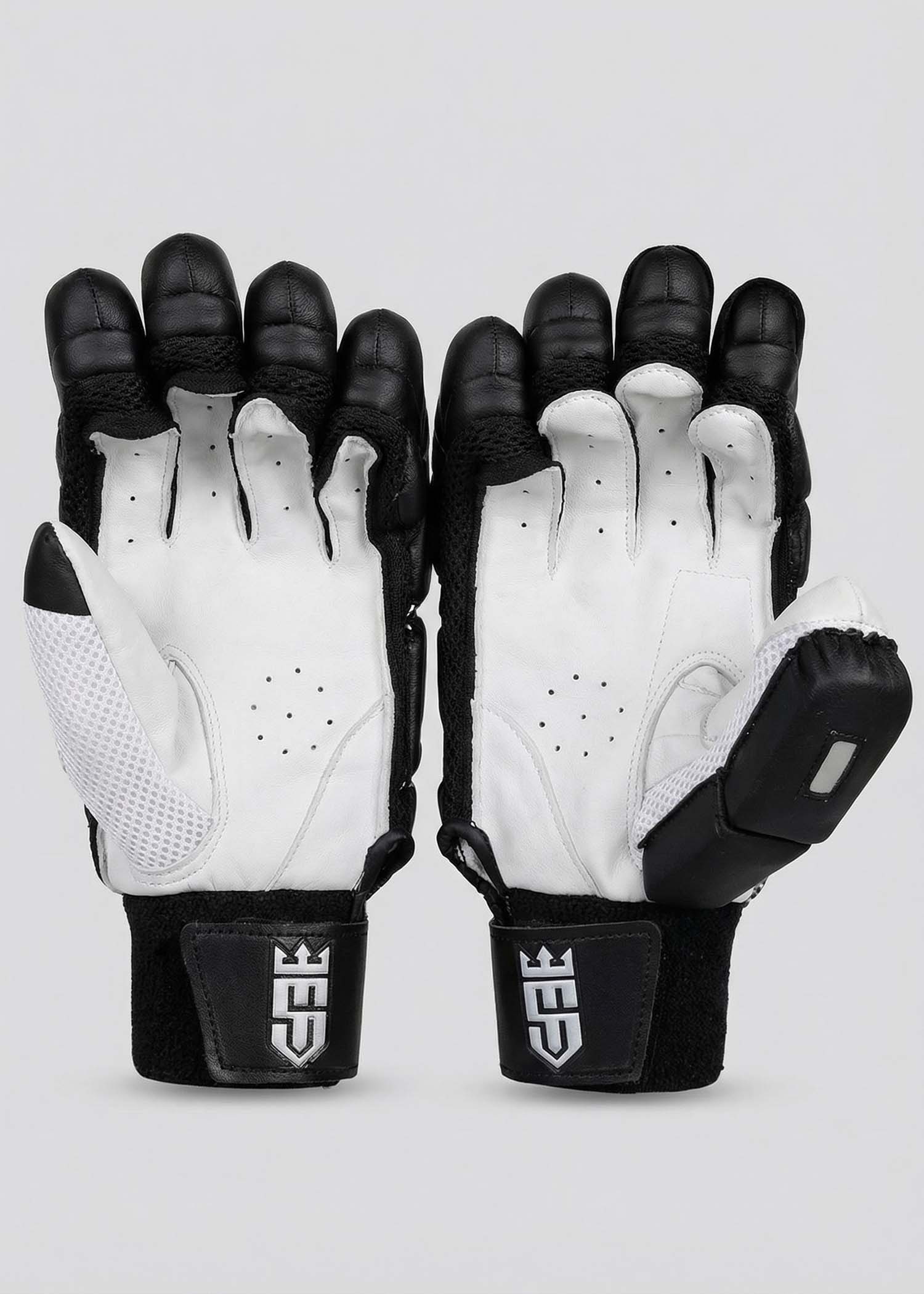 Finished in a sleek all-black design with silver detailing, these gloves are made to stand out while maintaining a professional performance feel. The finger construction is shaped to support natural flexibility, helping batters play freely through attacking strokes and controlled defense. Protective padding across the fingers and backhand offers dependable coverage against impact, while the balanced structure keeps the gloves comfortable through long innings.
